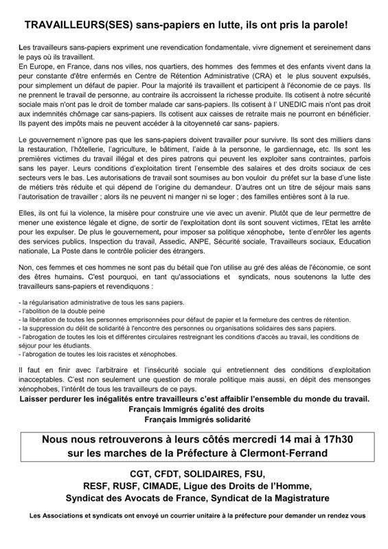 14 Mai : Travailleurs sans-papiers rassemblés à Clermont-Fd 2008-05-13T19:25:34+02:0013 mai 2008|Catégories : À LA UNE| Nous nous retrouverons à leurs côtés mercredi 14 mai à 17h30 sur les marches de la Préfecture à Clermont-Ferrand. jpg_TRAVAILLEURS_sans_papiers_tract_pour_le_14_mai.jpg Partagez cet article ! FacebookXWhatsAppTelegramEmail Articles similaires 18 décembre 2025 – Journée internationale des droits des migrant·e·s 18 décembre 2025 – Journée internationale des droits des migrant·e·s 11 décembre 2025 Loi sur la protection sociale complémentaire dans la Territoriale : une première avancée qui en appelle d’autres Loi sur la protection sociale complémentaire dans la Territoriale : une première avancée qui en appelle d’autres 11 décembre 2025 Pour la création d’un corps d’AESH : en grève le mardi 16 décembre ! Pour la création d’un corps d’AESH : en grève le mardi 16 décembre ! 11 décembre 2025 CP intersyndical de soutien à Sophie Binet CP intersyndical de soutien à Sophie Binet 8 décembre 2025 Le 2 décembre, toutes et tous mobilisé.es pour la justice sociale, fiscale et environnementale ! Le 2 décembre, toutes et tous mobilisé.es pour la justice sociale, fiscale et environnementale ! 26 novembre 2025