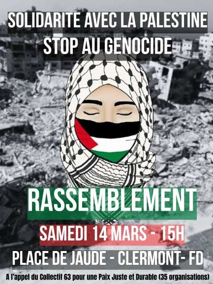 GRANDE MANIFESTATION samedi 29 novembre 14h place de la République à PARIS à l’appel de 70 organisations Un bus est prévu depuis Clermont-Fd (départ 06h00), pour réserver une place : c'est par ici ! Lire le communiqué FSU du 22 octobre https://fsu.fr/communique-pour-un-cessez-le-feu-definitif-en-palestine-une-paix-juste-et-durable-reste-a-construire/ Extraits des mandats de la FSU de février 2025 : " La guerre en Palestine n’a pas commencé le 7 octobre 2023 après le massacre [...]