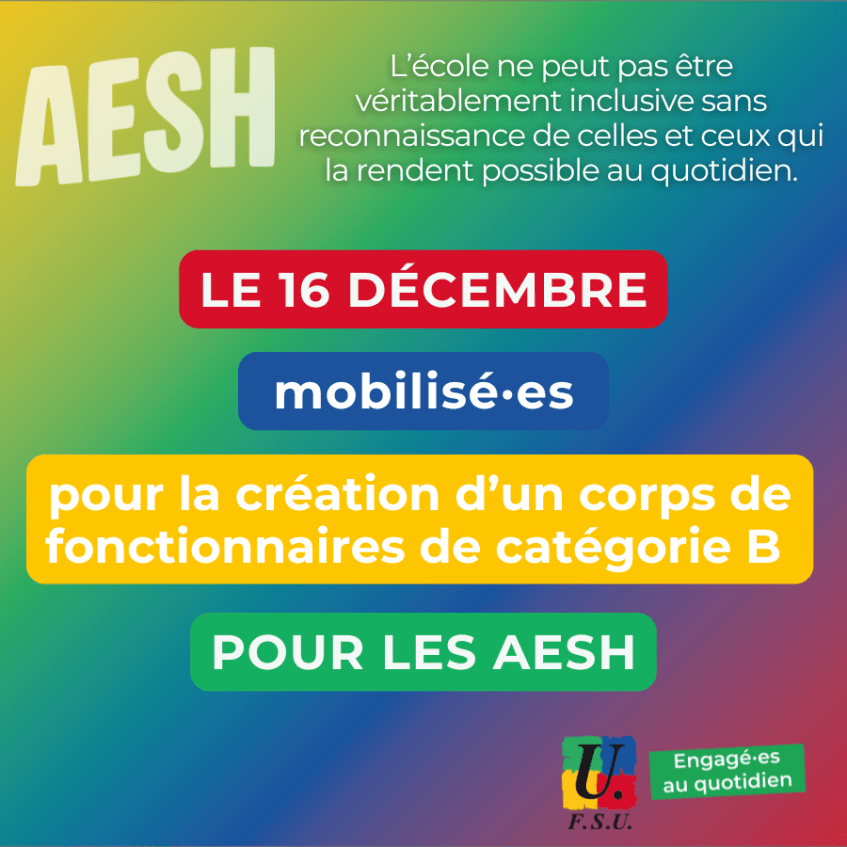 La campagne pour la création d’un corps de catégorie B pour les accompagnant·es d’élèves en situation de handicap se poursuit le mardi 16 décembre 2025 dans le cadre de la semaine de mobilisation intersyndicale du 15 au 19 décembre. Pour cette journée de grève, le SNES-FSU, le SNUEP-FSU et la FSU-SNUipp ont déposé des préavis de grève. Lire communiqué Dans le Puy-de-Dôme : AG à partir de 9h30 à la Maison du [...]